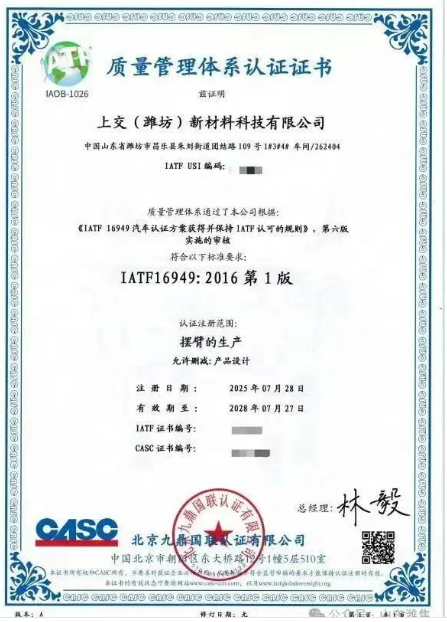 上交(濰坊)新材料公司成功取得IATF16949質(zhì)量管理體系認(rèn)證證書